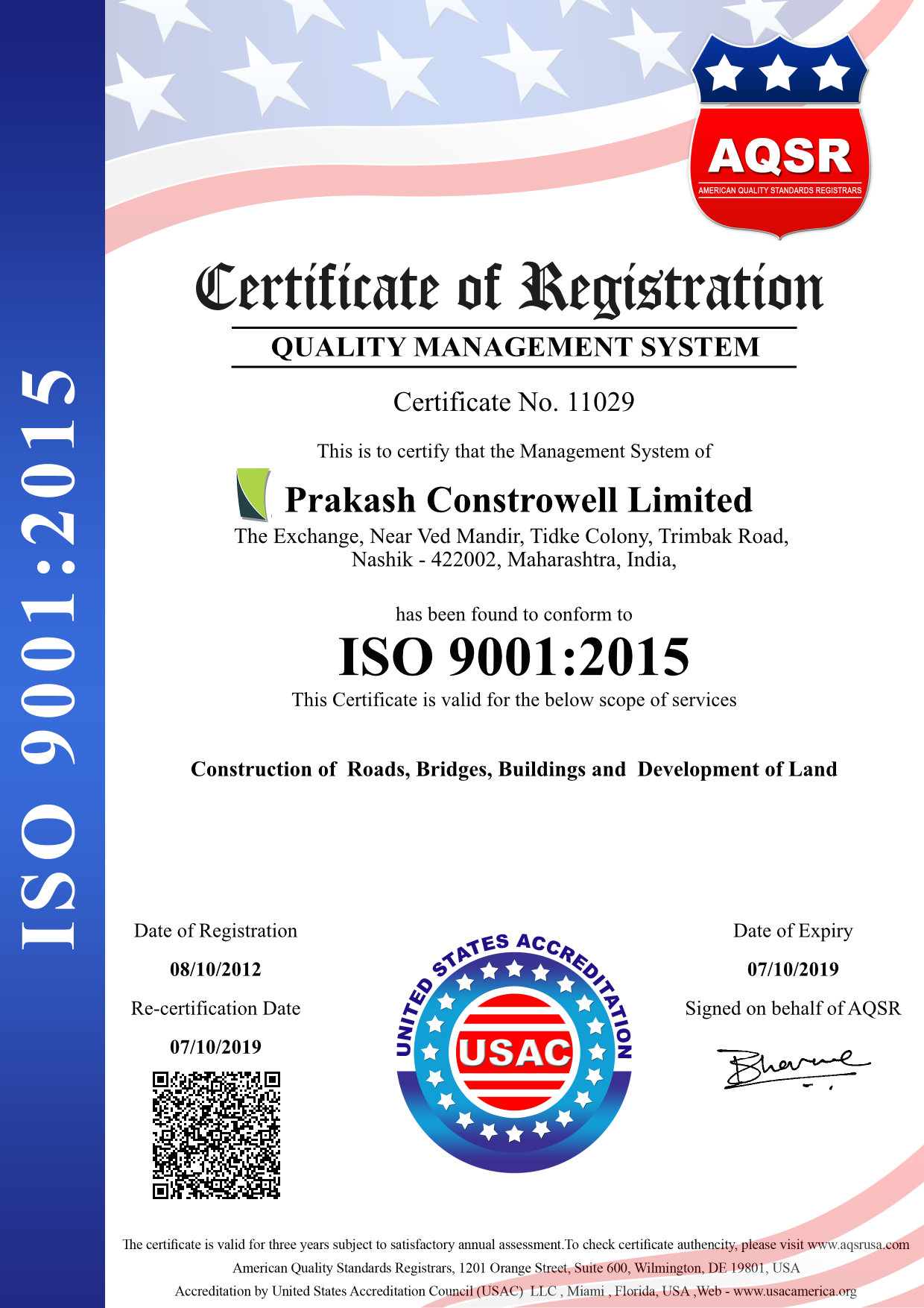 The Group was accredited with ‘ISO 9001:2015’ quality management system certificate for construction of Roads, Bridges, Buildings and Land Development.