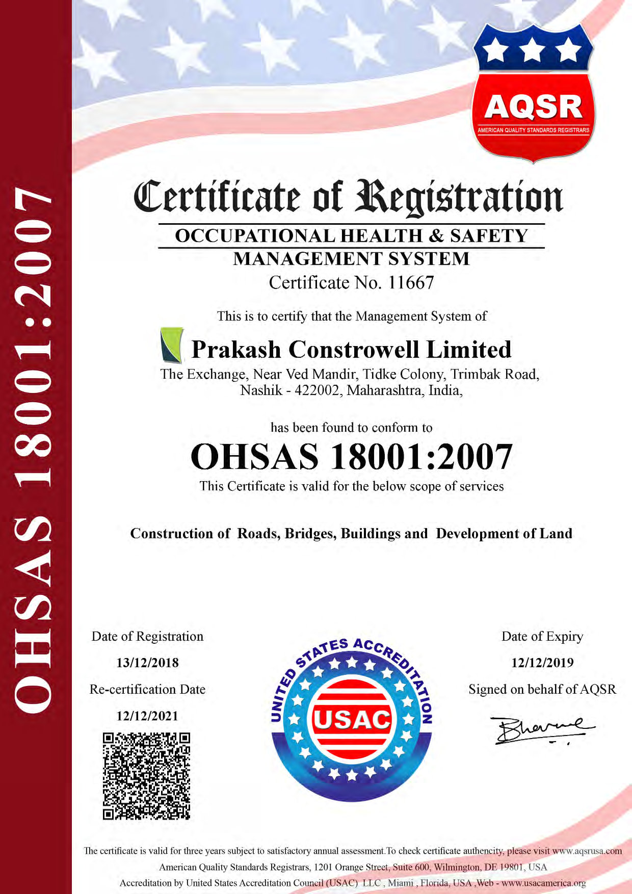 The Group was accredited with ‘OHSAS 18001:2007’ Occupational Health & Safety Management System Certificate for construction of Roads, Bridges, Buildings and Land Development.